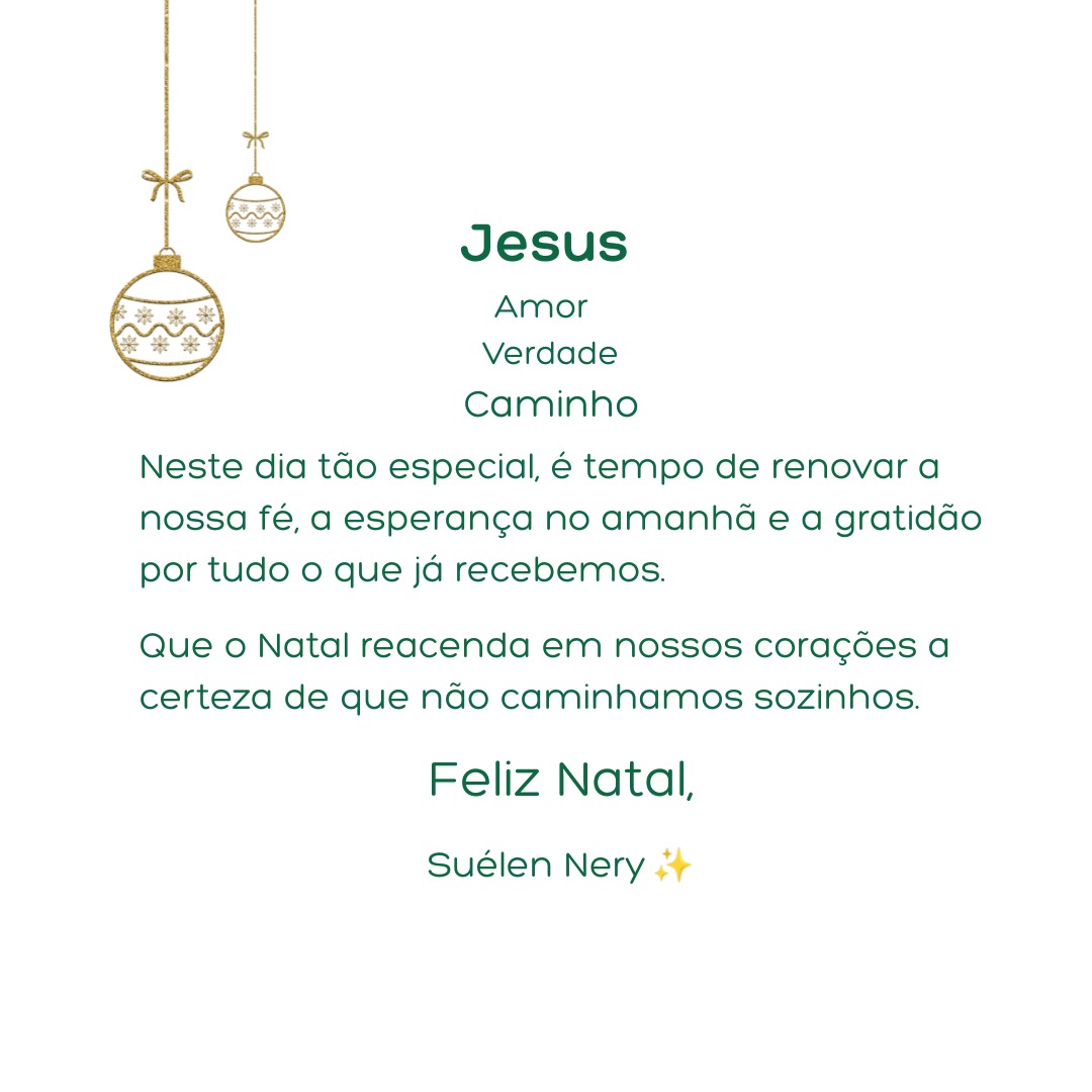 ✝️❤️🕊️ JESUS: amor, verdade e caminho. Neste dia tão especial, é tempo de renovar a nossa fé, a esperança no amanhã e a gratidão por tudo o que já recebemos. Que o Natal reacenda em nossos corações a certeza de que não caminhamos sozinhos.